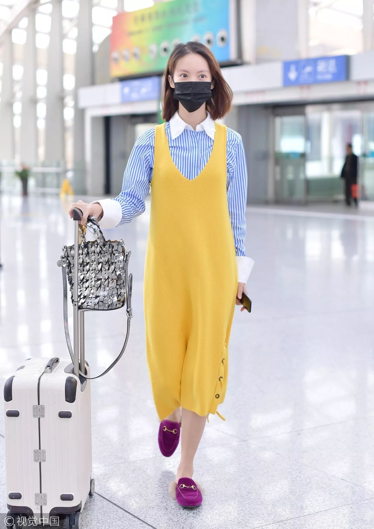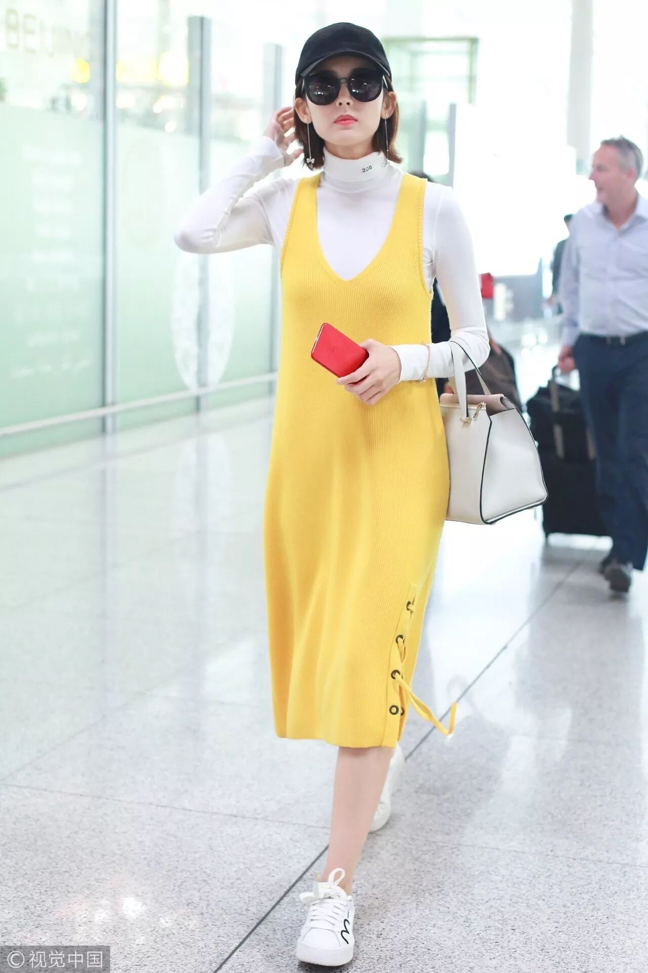 ▲古力娜扎头戴黑色棒球帽,黑色圆形太阳镜遮面,身穿白色修身针织高领衫,外穿柠檬黄针织背心裙,脚穿Puma系带休闲小白鞋,欢快的柠檬黄搭配白色让人非常舒服,整个造型既舒适又休闲。