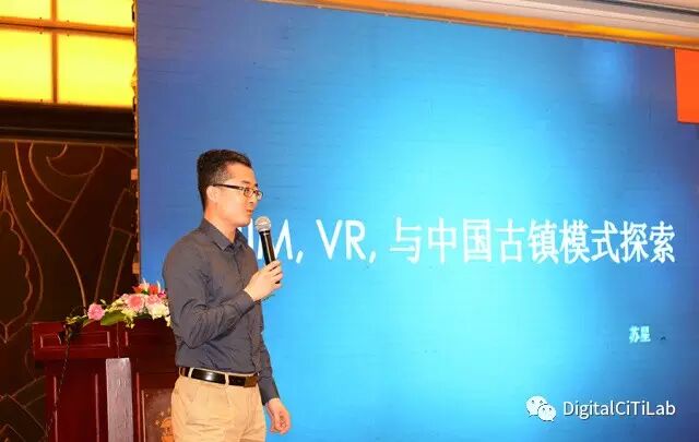 Xing Su博士为与会嘉宾分享了BIM,VR,与古镇模式探索。首先他谈到了对古镇模式的理解和思考。接下来他介绍了BIM和VR技术在古镇设计中的角色定位,比如可用BIM进行模块化设计、快速方案比选和可视化信息展示,VR技术可用于可行性研究、全方位体验测试和新商业模式探索。最后,Xing Su博士还为与会嘉宾展示他参与的实践案例。