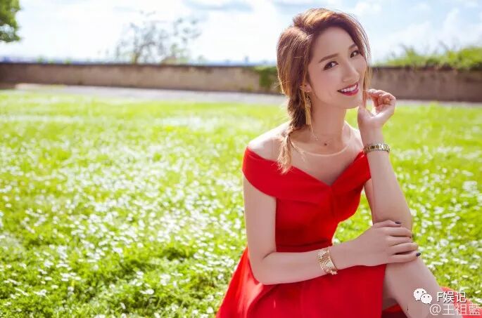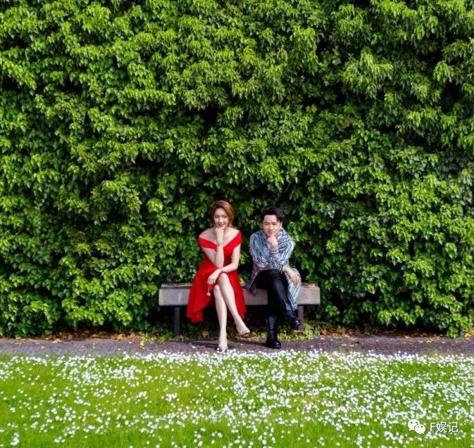 除了夫妻俩的合照,还有李亚男的单独美照,她身穿露肩红色礼服坐在草地上。