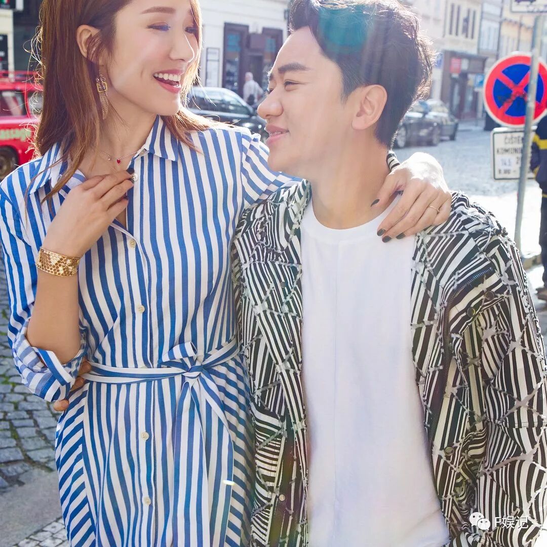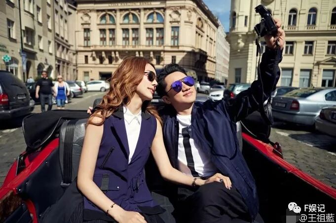 夫妻俩还坐在敞篷豪车里面自拍,两人都戴着墨镜,王祖蓝少有的装扮成型男。