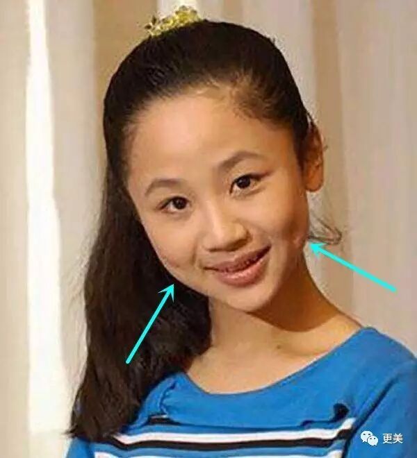 稍微长大一些二十出头的年纪,面部发育完全,就能看出,她的颧骨附近是有轻微凹一点点的,面部的皮下脂肪量并不那么多