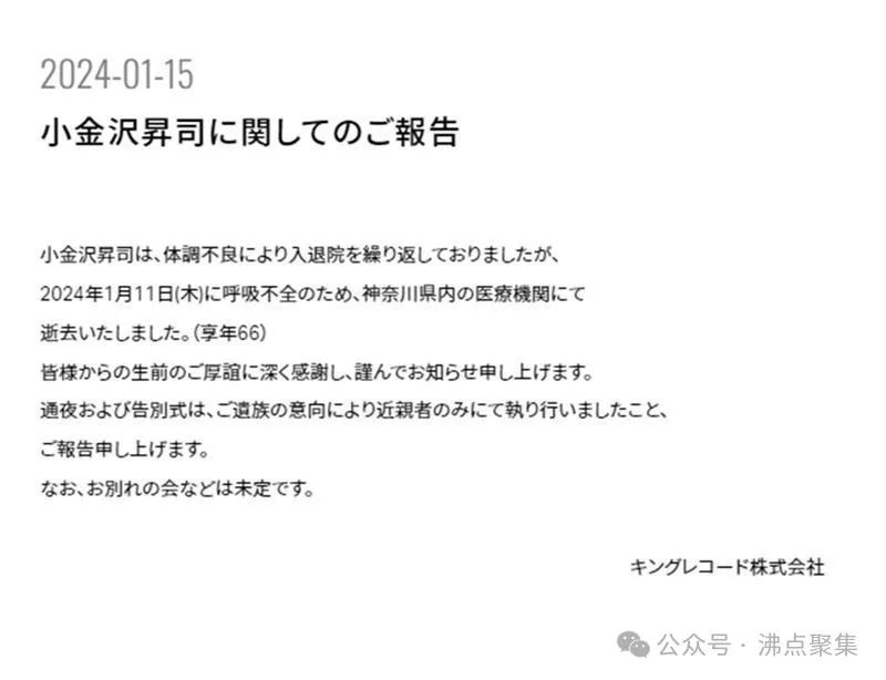 然而,日前却传来一则悲讯,小金沢升司于1月16日传来令人痛心的消息,享年66岁,因呼吸衰竭在神奈川县医院不幸离世。而他的经纪公司随后也证实了这一消息。小金沢升司是音乐界的重要人物,他的离世让粉丝们感到沉痛和惋惜。