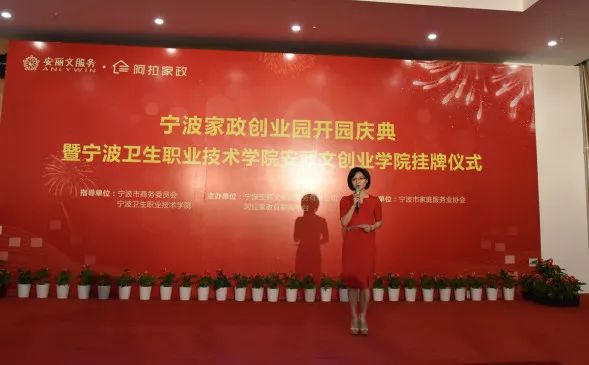 开园庆典在主持人热情洋溢的主持下拉开帷幕。主持人介绍道,宁波家政创业园是在宁波市商务委员会领导关心、鼓励、指导下,在宁波卫生职业技术学院大力支持下,在宁波市家庭服务业协会帮助下,由宁波安丽文家庭服务有限公司独立投资1000万元建设而成。