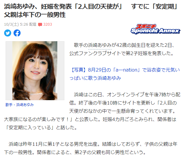 10月2日是日本乐坛天后滨崎步42岁的生日,在这一天,滨崎步刚刚结束线上演唱会后,突然在官方歌迷会宣布自己已怀二胎。