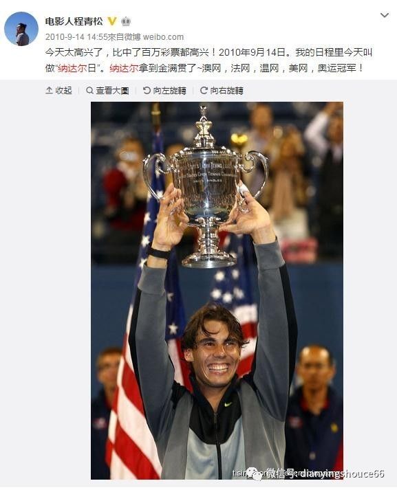 2010年9月14日我发的的微博截图,这天,纳达尔拿到了美网冠军,成就了金满贯的伟业,我比中了百万彩票还要高兴。
