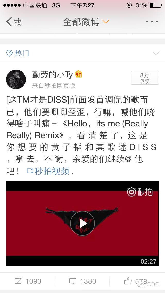 Ty.昨天早晨发布给黄子韬的Diss《Hello,its me (Really Really) Remix》在转发1000余次后,于昨日晚7点左右被新浪屏蔽。