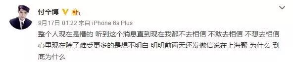 付辛博:整个人现在是懵的 听到这个消息直到现在我都不去相信 不敢去相信 不想去相信 心里现在除了难受更多的是想不明白 明明前两天还发微信说在上海聚 为什么 到底为什么