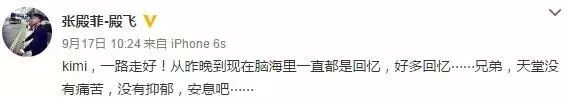 张殿菲:kimi,一路走好!从昨晚到现在脑海里一直都是回忆,好多回忆⋯⋯兄弟,天堂没有痛苦,没有抑郁,安息吧⋯⋯