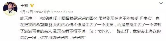 王睿:昨天晚上一夜没睡 闭上眼睛就是满满的回忆 虽然到现在也不能接受 但事实一直在把我的希望撕裂 此刻的心情不像是失去了一个朋友,而是感觉失去了一个装载了满满青春的亲人 到现在我不得不说一句:“k小米,一路走好,我会去上海送你最后一程,你在那边好好的,好好的”