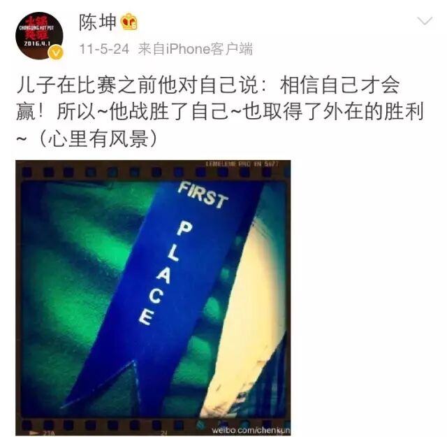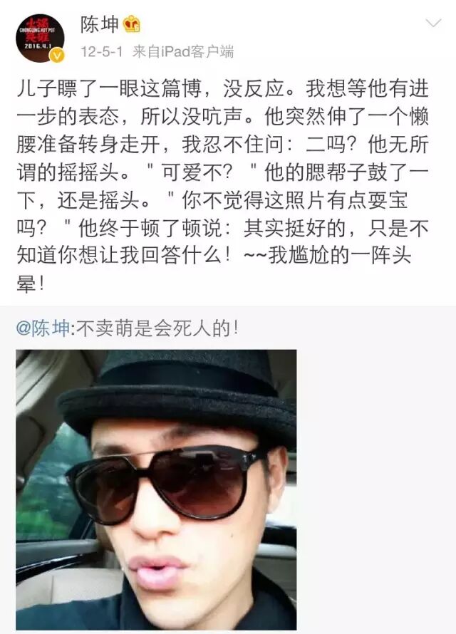 在Alex的成长过程中,陈坤一直都又年轻又帅。从他祝爸爸“青春无极限,越来越帅”就能看出他们之间很亲,以及这个爸爸平时的自恋和逗比,“不卖萌会死”属性↓↓