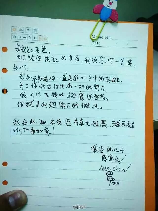 还给陈坤写了一首诗,说爸爸是他心目中的英雄。“你就是我翅膀下的微风”这句写得太美妙,被你的才华圈粉啦(后来陈坤在采访中提到这首诗,还说儿子中文不太好,真是要给他一个大白眼)↓↓