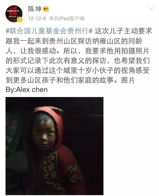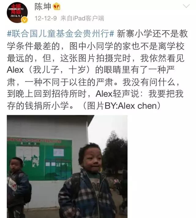 陈坤说自从做了父亲后,越来越发现自己的心更像小孩了。但同时也越来越比以前扛事儿。因为每当我做了什么好的事情时,儿子都会由衷地夸赞我老爸你真帅!”而且愿意跟爸爸一起去做。10岁的Alex跟陈坤去贵州山区探访同龄人,拍下此行的照片,还要把自己的压岁钱捐出来↓↓