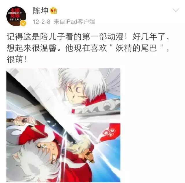 陈坤常常在外地工作,不能每天跟儿子待在一起。怎么办呢?知道儿子喜欢看动漫,陈坤为了跟他交流,也学着看。这样他们每天看一集,晚上就可以交流。后来陈坤就真的成了一个动漫迷,有时候工作太忙,儿子会看了告诉他。