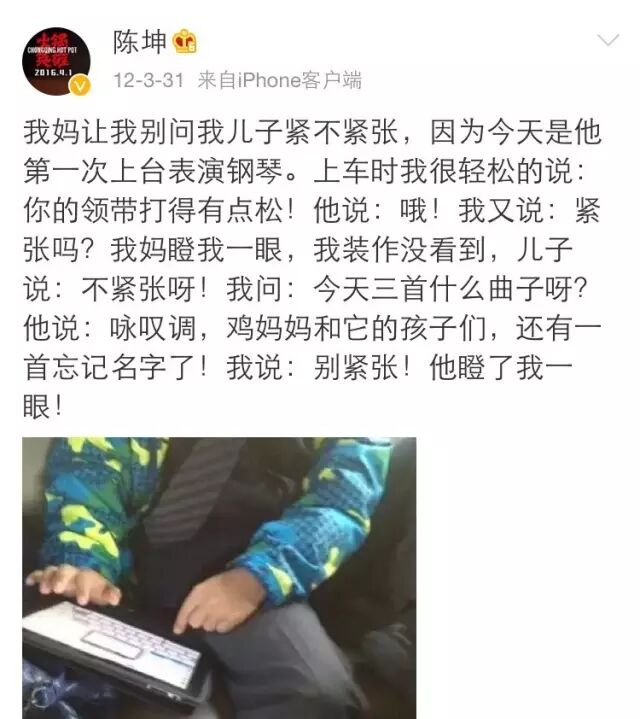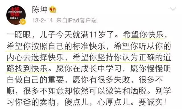 祝儿子11岁生日快乐,也不忘调侃“别学习你爸的卖萌”。可是其它的正经话,真的让人觉得陈坤是个有学识有思考,三观超正,能给孩子正确引导的好爸爸。为人父母的不妨多一些了解和借鉴↓↓