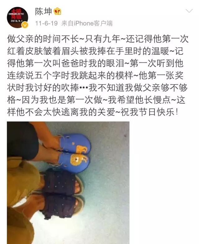 2011年6月19日父亲节,陈坤在微博上袒露他的爱子情深,并晒了他们的大脚小脚照,他作为一个父亲的形象越来越立体↓↓