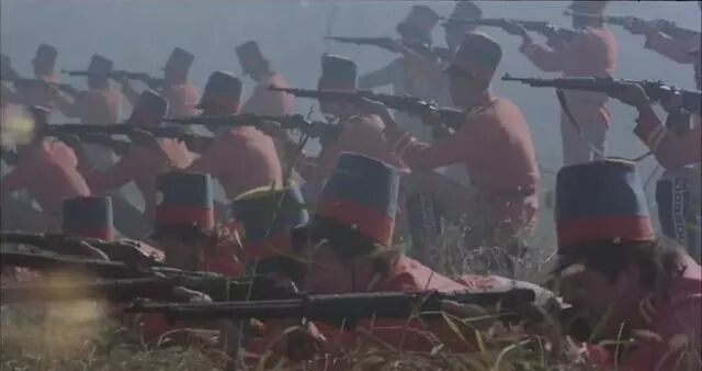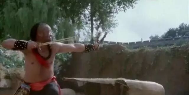 混星子玻璃花与主人公傻二的最后一次较量,是在古长城下的山顶上。傻二与八国联军交仗时失了“神鞭”,但他腰插双枪,使出百步穿杨的绝活,英豪气魄终于使玻璃花跪服。这组镜头也是影片的结尾。