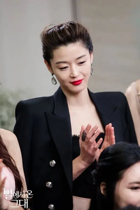 39岁的全智贤前几天还身着一袭深蓝色长裙出现在这部剧的新闻发布会上,和以往一样的沉稳大气风范,短发造型干练且优雅,女明星光环依旧耀眼。