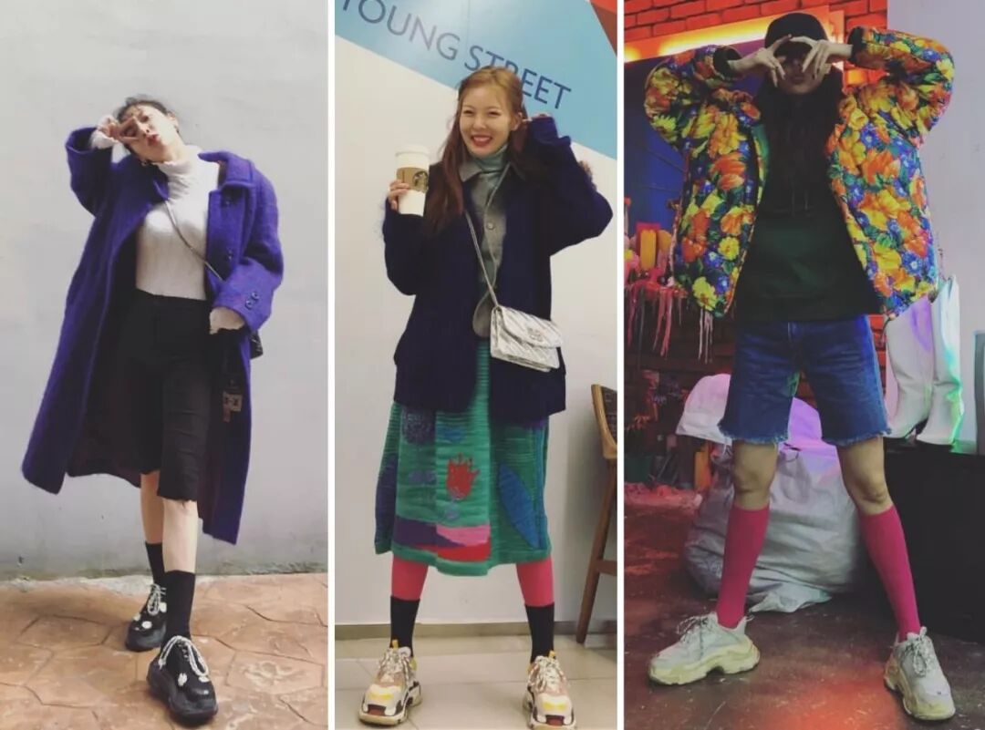 她特别爱穿中筒袜,刚好到小腿肚子,各种颜色图案,出镜率极高。