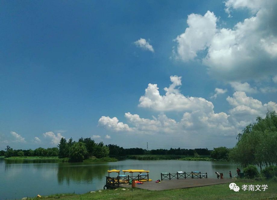 画廊游艇、葱郁风景、白云蓝天,鸟窝荷花,倒影进碧绿的水光里。