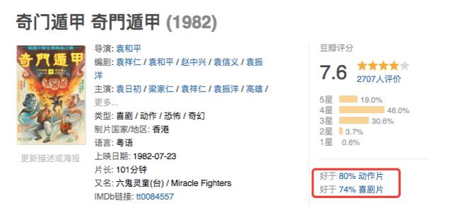 关于《奇门遁甲》这部电影,早在1980年代,袁和平就将该电影搬上了大屏幕,并在豆瓣上获得了7.6的高分,好于80%的动作片,74%的喜剧片。