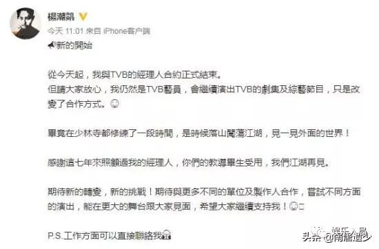 今天杨潮凯也在社交网络发声明宣告和TVB的经理人合约正式结束,成为吴卓羲黄宗泽黄德斌陈智燊等人之后又一个离巢的小生。尽管改签部头约未来仍会和无线有合作,但变成了“外人”受捧程度差得可不是一星半点,能做出这么大的决定着实佩服他的勇气。