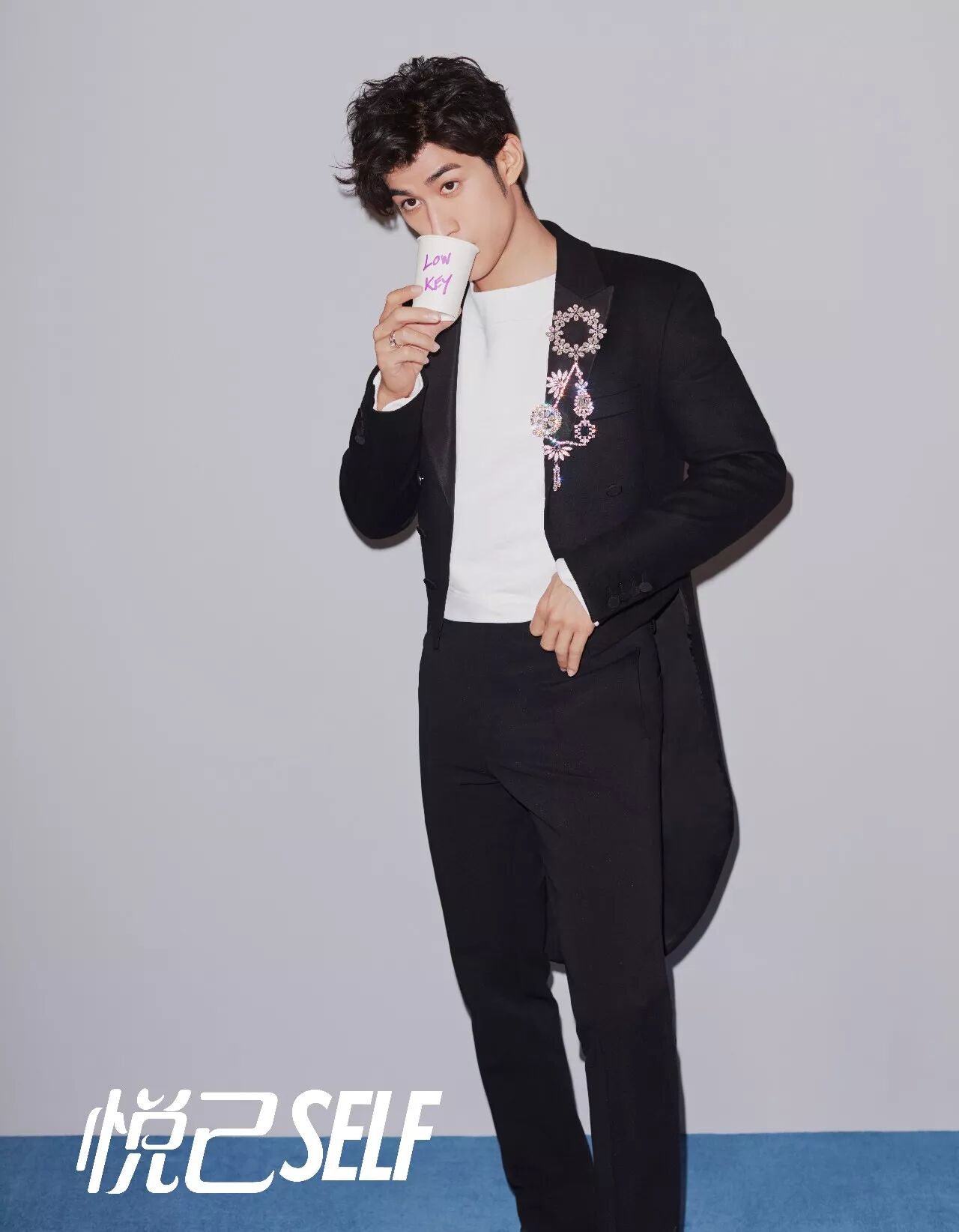 摄影师找来了一个一次性纸杯当道具,拿出了一支马克笔,“写几个字吧,我字不好看,治廷你来写。”“写什么呢?‘霸气’两个字!”说完,李治廷哈哈大笑起来,几秒钟后,深吸一口气,想了想,拿起马克笔,唰唰唰在空白的纸杯上留下了“Low Key”(低调)。