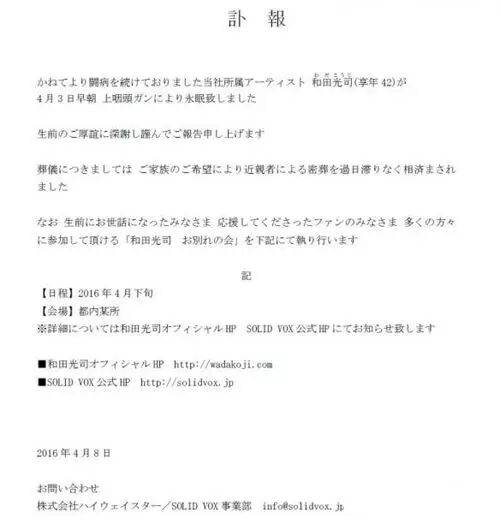 歌手和田光司因咽喉淋巴癌于4月3日早晨逝世,年仅42岁。