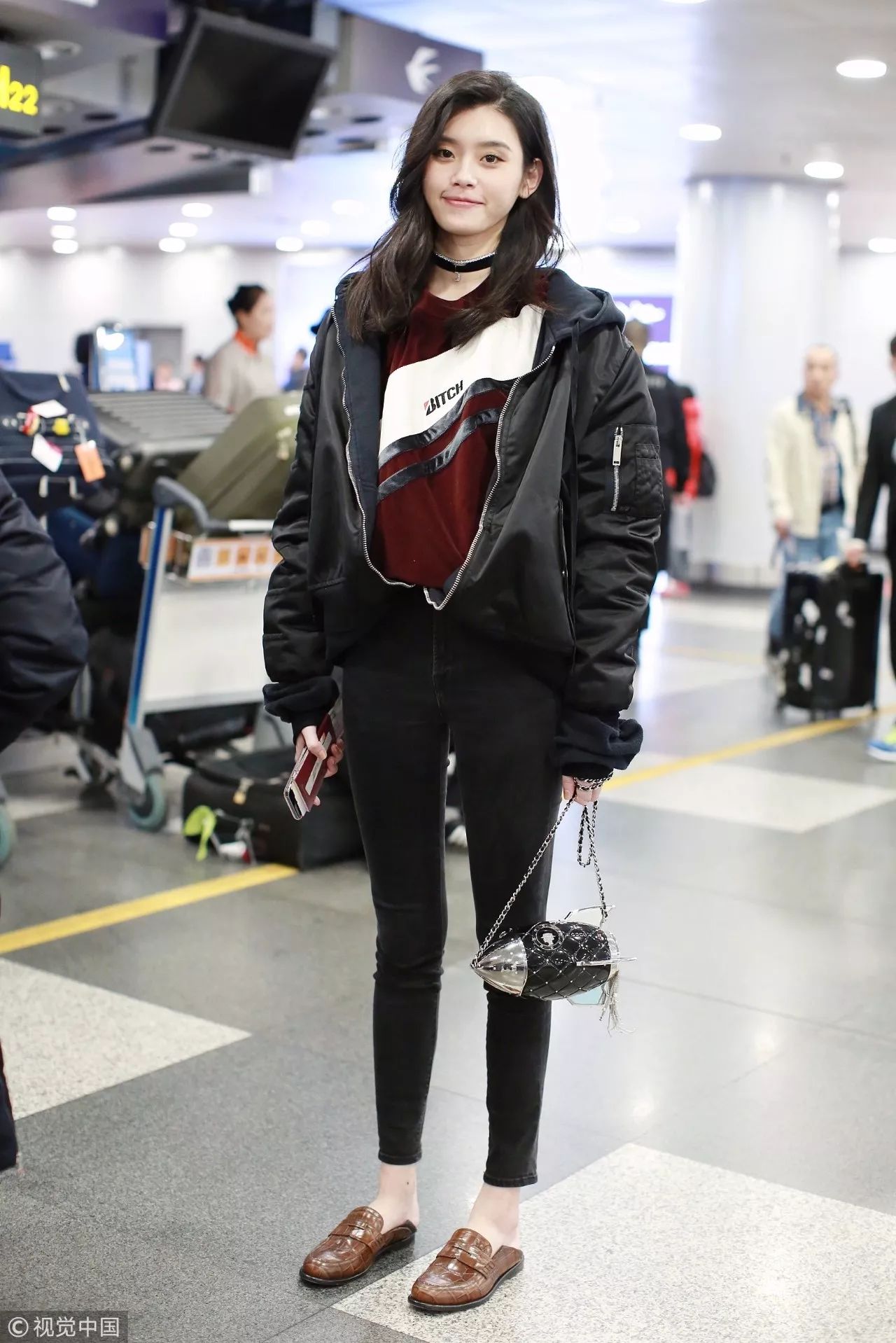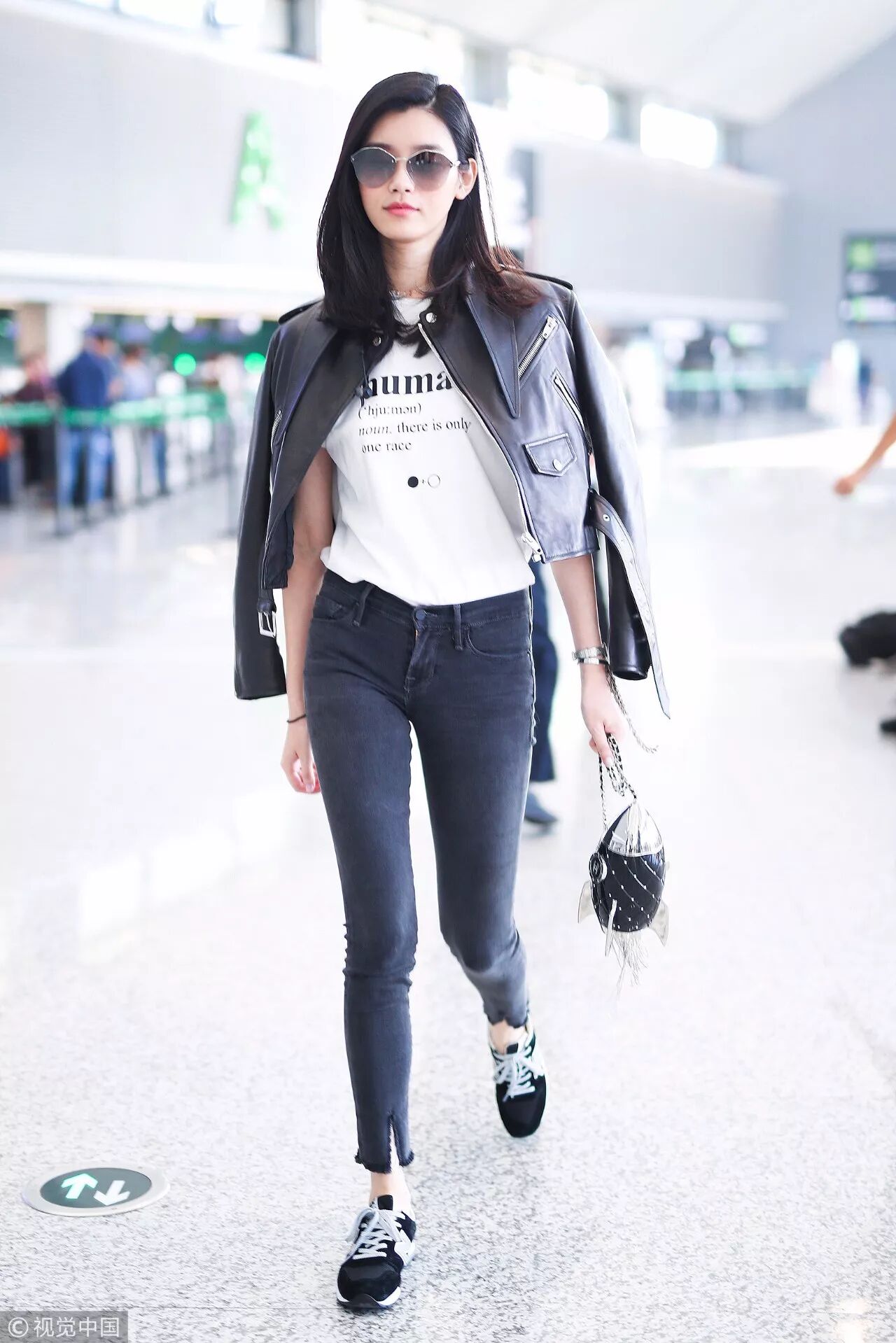 ▲皮衣Ming酷炫现身,极简的白T和开叉铅笔裤,酷劲爆表“火箭包”又抢镜了。