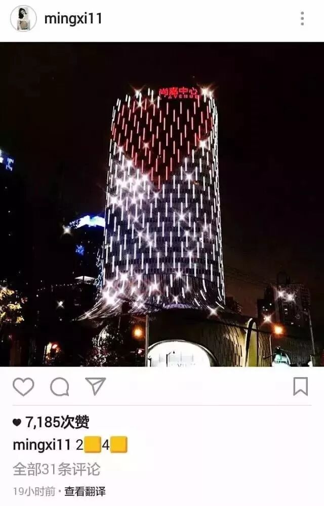 ▲11月4日奚梦瑶还特意在ins上传了一张尚嘉中心的夜景图,尚嘉中心的LED幕墙上有明显的心形图。奚梦瑶还留言了“24”,何猷君也点了赞,更巧的是尚嘉中心的主人,就是何猷君的妈妈,赌王的四房太太梁安琪。