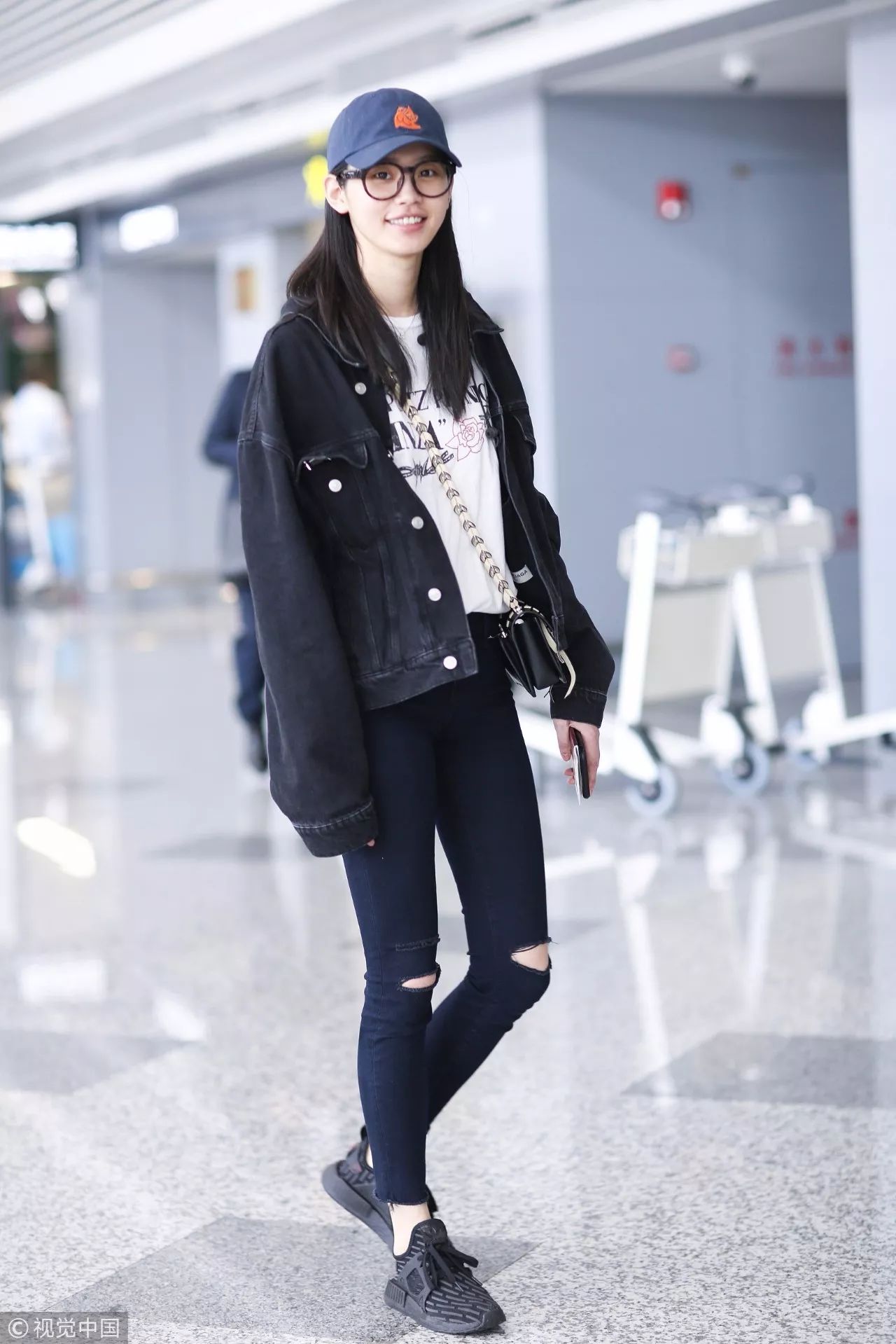 ▲黑色夹克内搭涂鸦字母印花白T恤,下装搭配穿紧身破洞裤,素颜+极简风的小明瞬间减龄N岁。