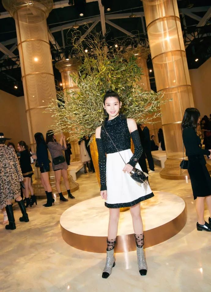 ▲最近的CHANEL在成都大秀,身穿CHANEL 2017秋冬黑白性感露肩连衣裙的小明依然梳着高马尾,背着火箭包,未来感和俏皮感共存。