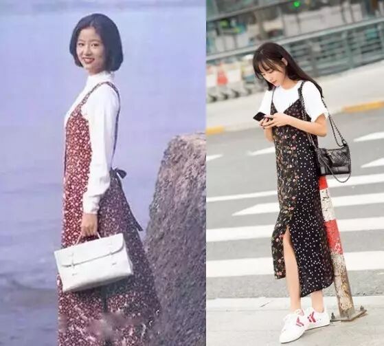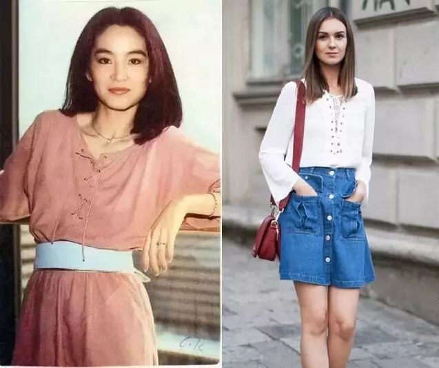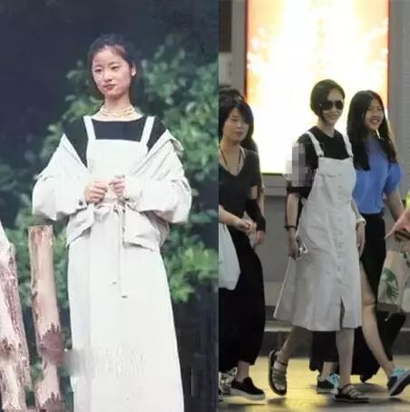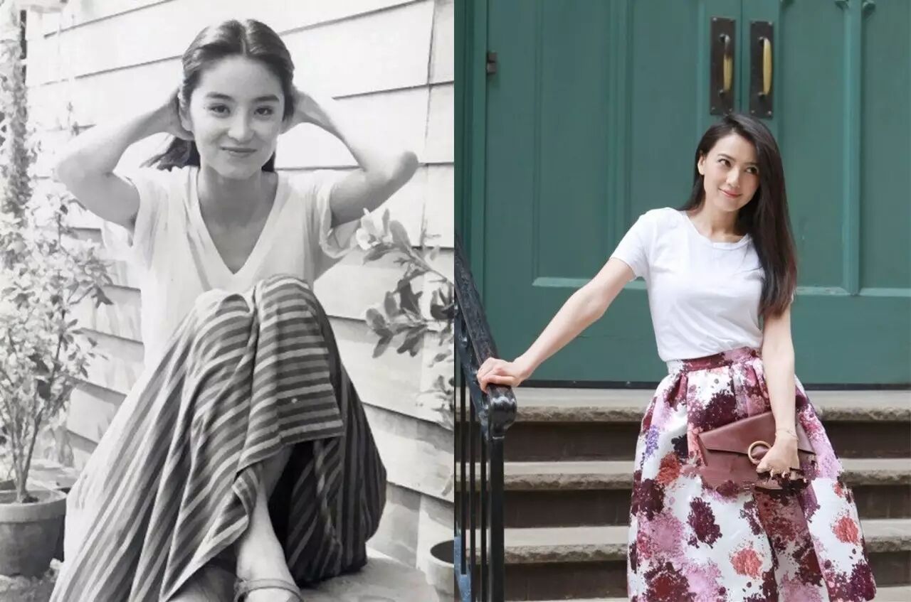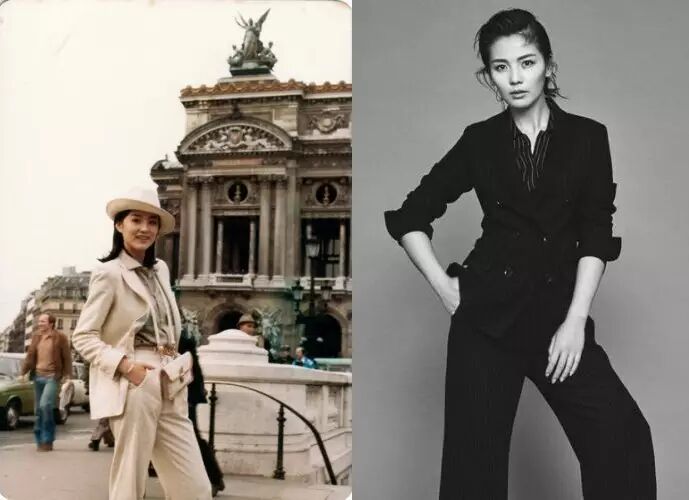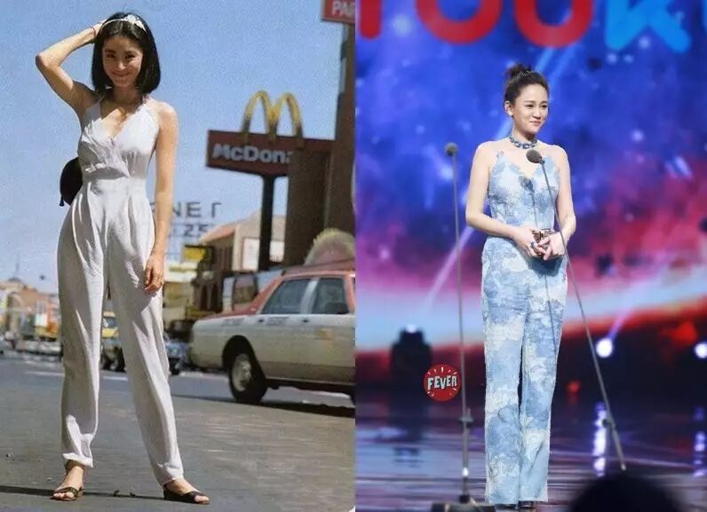 比如近两年流行的连体裤,林青霞早就在自己年轻时期尝了把鲜。清新大气的白色瘦腰连体裤,把林青霞衬托的清爽干净。反观陈乔恩的连体裤,不知道是尺寸太小还是体型没控制好,整体的时髦度还是略逊林青霞