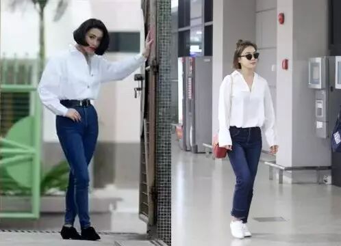 白衬衫和牛仔裤的经典搭配,张敏诠释的相当到位啊~(就是腿粗了点)