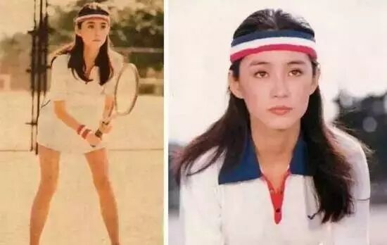 林青霞早就把最近流行的发带戴在头上了。一身白色运动裙,领口红蓝两色相撞。搭配红蓝白三色发带清新自然
