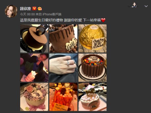 2月1日零点,阿娇钟欣潼在微博发文:“这是我农历生日最好的礼物,谢谢你的爱,下一站幸福”,并晒出生日许愿照片和大钻戒,宣布喜讯。