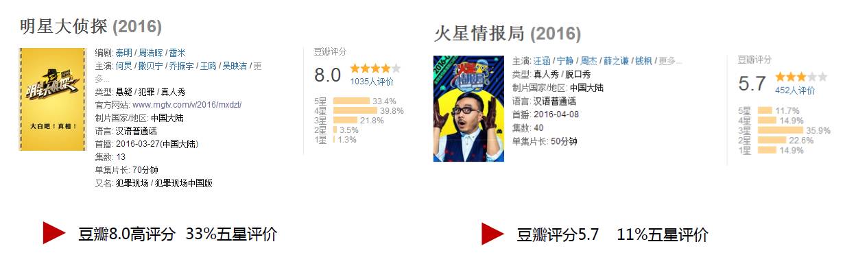 一档节目好不好看,一部电视剧火不火,小编我一般都会先上豆瓣看看评分。《明星大侦探》上线至今豆瓣评分高达8.0分,《火星情报局》上线后豆瓣评分为5.7分,用户口碑较低于《明星大侦探》。在媒体关注上,《火星情报局》相关新闻约1030篇,《明星大侦探》相关新闻约2320篇,似乎媒体更为亲睐烧脑更多、话题更多的《明星大侦探》。