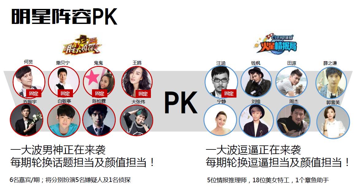 悬疑烧脑的《明星大侦探》由芒果TV全新自制,何炅、撒贝宁、吴映洁、王鸥为四大固定嘉宾,每期6位嘉宾分别扮演5名嫌疑人及1名侦探。乔振宇、白敬亭、大张伟、陈若轩等一波男神颜值担当火热来袭,节目中的角色设置也是话题十足,第三期“节目可爱担当鬼鬼首挑侦探一角”、“NZND鲜肉男团”、“新成员陈若轩”等相关话题层出不穷。由汪涵担当局长的《火星情报局》则以特工为单位,守护提案,舌战群儒。钱枫、周杰、薛之谦等逗比担当为网友的“脑洞大开”提供了施展平台,薛之谦逗趣表情包广为流传。