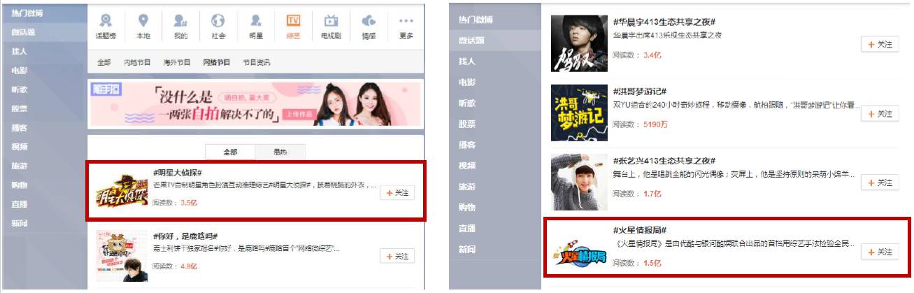 从体现网络热度的微博表现来看,#明星大侦探#等关键词的微博话题阅读量已破3.6亿,讨论量高达40.7万,位居微博热门话题榜整体网络节目榜单第一,同时也是综艺节目最热榜单TOP1。#火星情报局#微博话题阅读量1.5亿,讨论量21.9万,仅位居整体网络节目榜单第六位。3月27日#明星大侦探前戏篇#揭开了芒果TV自制综艺《明星大侦探》序幕,在微博的热议指数爆棚,3月27日晚节目播出当日,在PC和移动端微博搜索热度飙升,反观《火星情报局》自4月8日开播以来,在微博领域表现略为逊色。