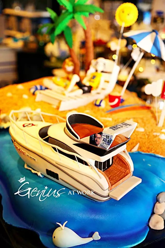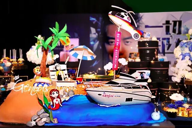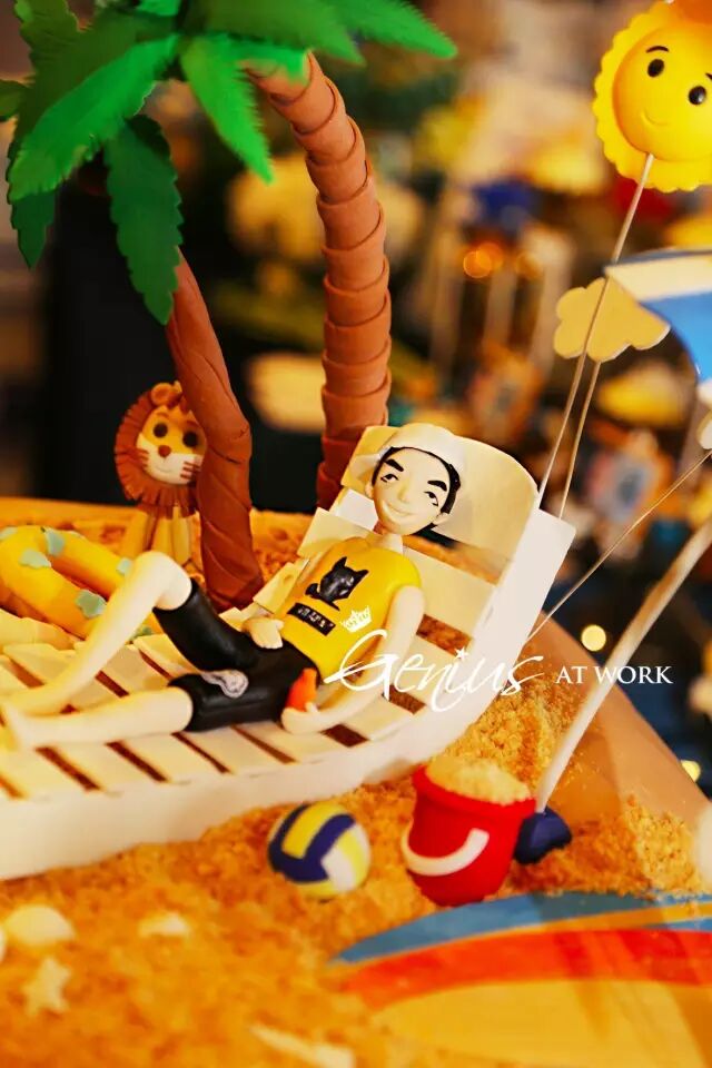 主蛋糕整体造型为一个私人小岛,恺恺在躺椅上惬意的晒着太阳, 更有炫酷装备直升飞机+游艇。分分钟实现了做个小皇帝的梦想。