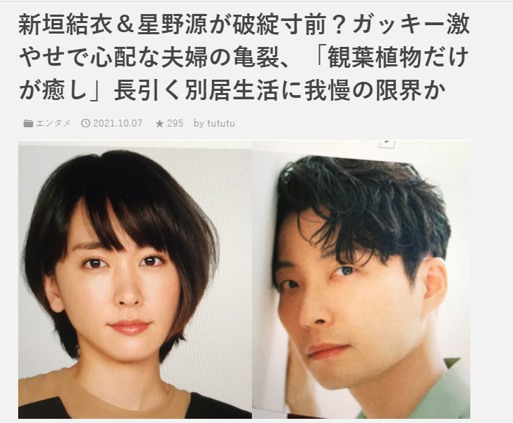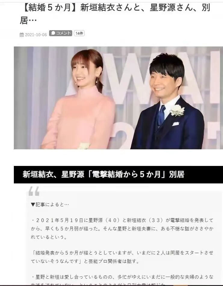 最近,日媒爆料出新垣结衣与星野源结婚5个月依然处在分居中的新闻。日媒也纷纷猜测两人关系是否面临着破裂。
