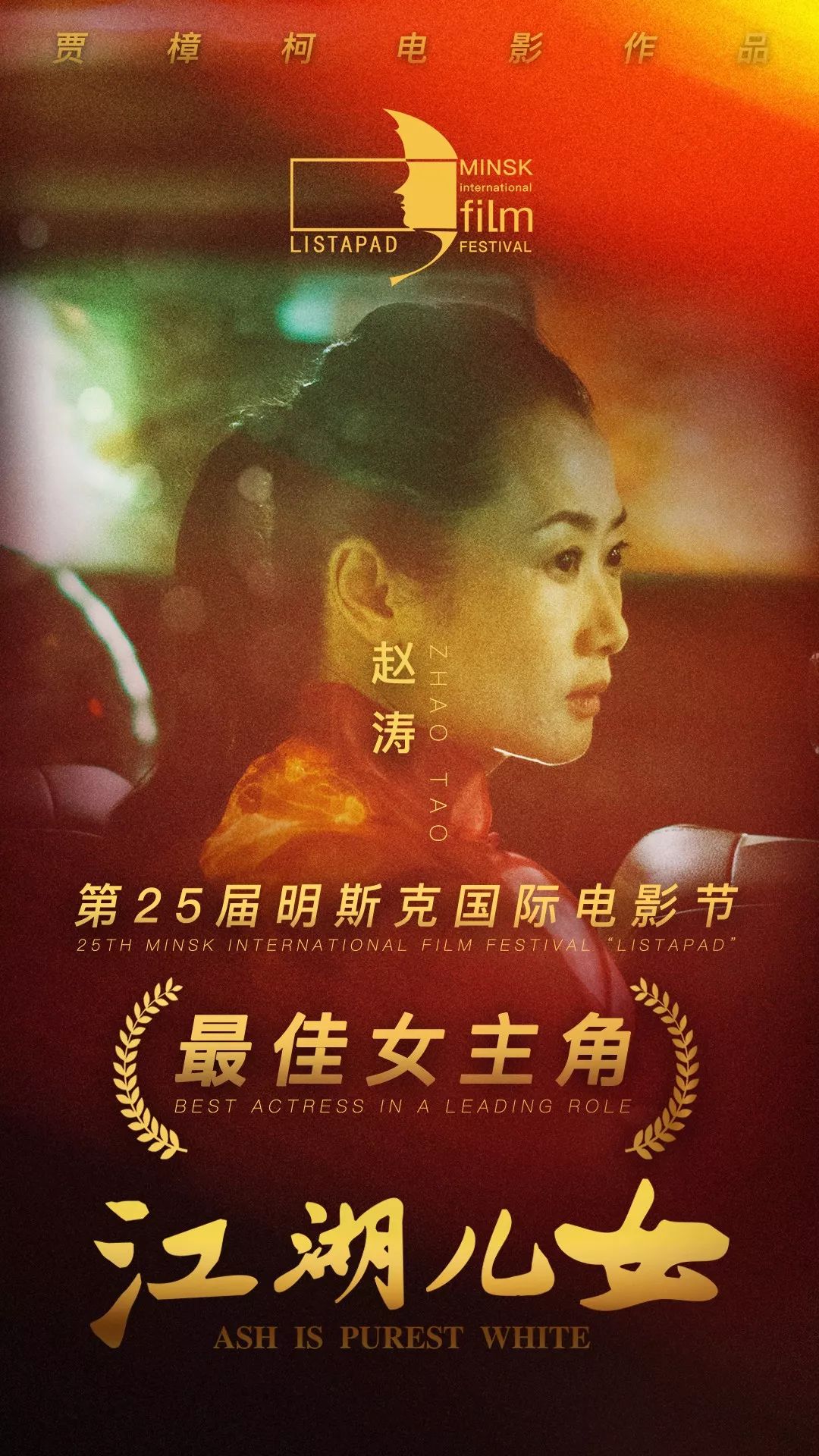 11月9日,第25届明斯克国际电影节在白俄罗斯首都明斯克落下帷幕,中国女演员赵涛凭借她在影片《江湖儿女》中的精彩表演,一举斩获最佳女主角奖,这是她一个月内收获的第二个国际影后桂冠,也是赵涛从影以来获得的第8个最佳女演员奖。同时,贾樟柯也凭《江湖儿女》获得最佳导演奖。