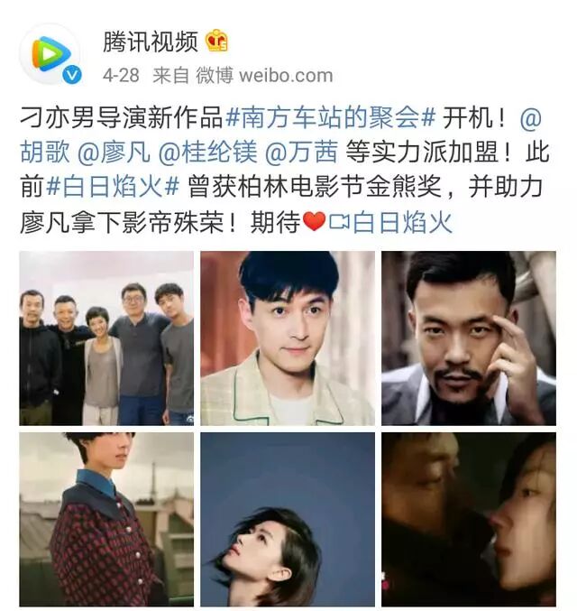 胡歌新戏《南方车站的聚会》4月28号在武汉开机,由刁亦男执导,合作搭档桂纶镁、廖凡、万茜一同主演。