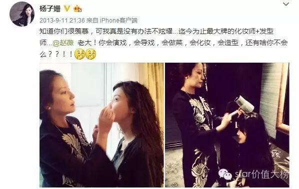 稍后,在同一天的21点36分,杨子姗也晒出赵薇给她化妆的照片,并大肆炫耀,称:“知道你们很羡慕,可我真是没有办法不炫耀.。。迄今为止最 大牌的化妆师+发型师...@赵薇老大!你会演戏,会导戏,会做菜,会化妆,会造型,还有啥你不会么??!!”晒出的照片中,有一张是赵薇在精心的给杨子姗化妆,另外一张,在帮杨子姗弄头发,看得出来,杨子姗很享受赵薇的照顾,得意的表情显露无疑。