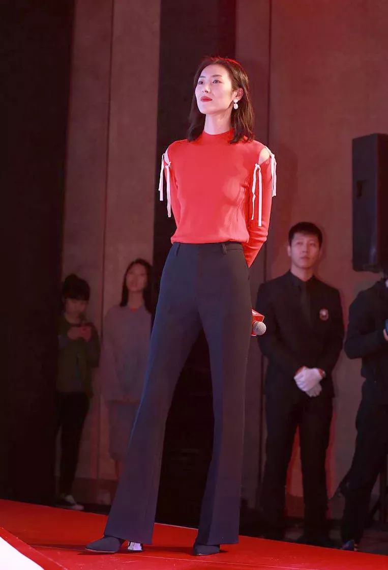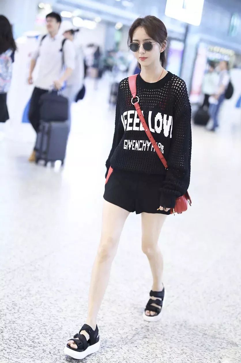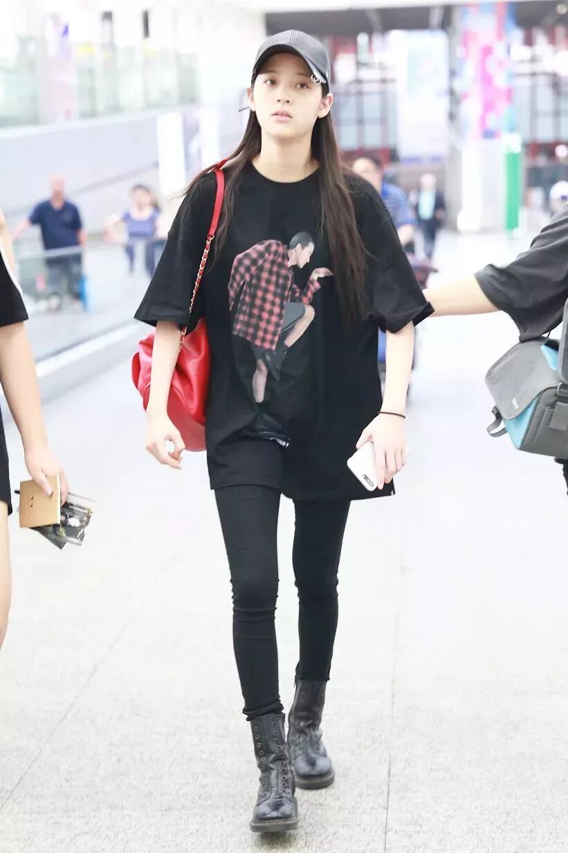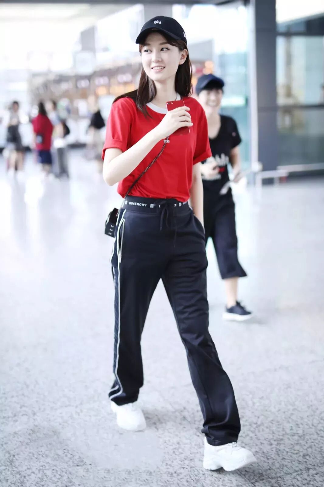 身材不错的妹子,不妨试试奚梦瑶的红色吊带+黑色小脚裤,一双黑色高帮马丁靴整体格调酷酷哒。