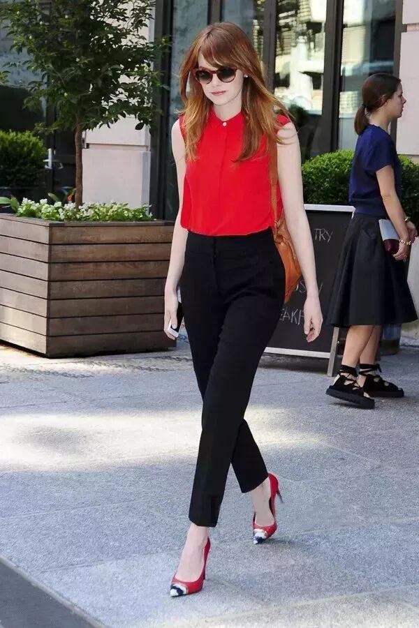 这个季节少不了一件红衬衫搭配黑色阔腿裤/黑色西装裤,即使在办公室也可以很有亮点。