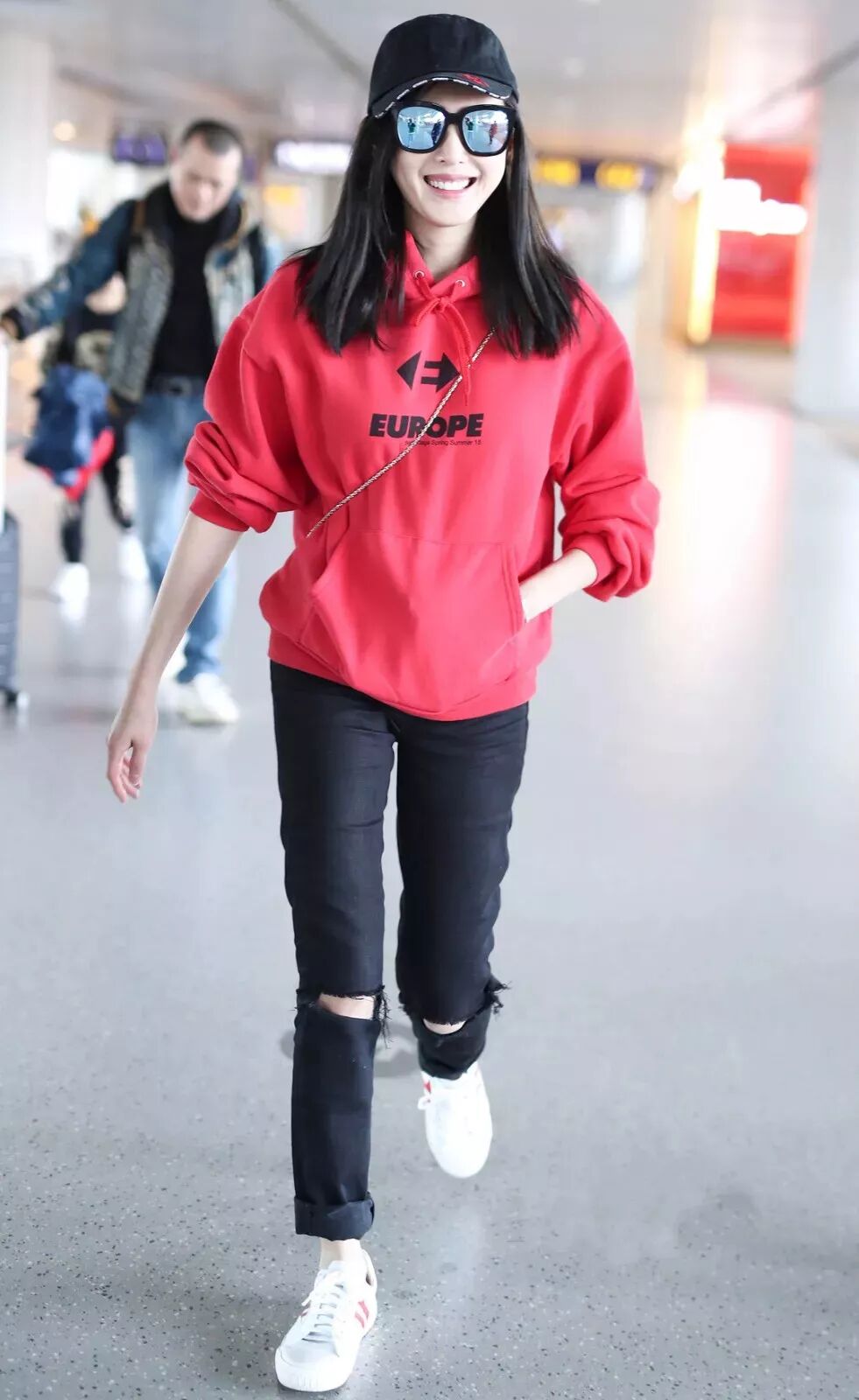 下了班后,一件红卫衣/红T恤搭配黑色小脚裤阔腿裤,小白鞋完成了休闲风!