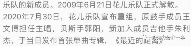 7月30日上午,有网友发现在某音乐平台上,花儿乐队已经更新了团体照及乐队简介。简介中明确表示花儿乐队在2009年解散,于2020年7月30日重组,而此前乐队中名气较大的大张伟不在组合中。