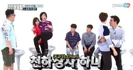 虽然充满汉子气质,不拘小节,但这样的hani却还是能得到很多男爱豆的喜爱,宋宥彬、姜敏赫都曾在节目中表达过对她的好感,好友金希澈更表示:想让hani陪自己一辈子~