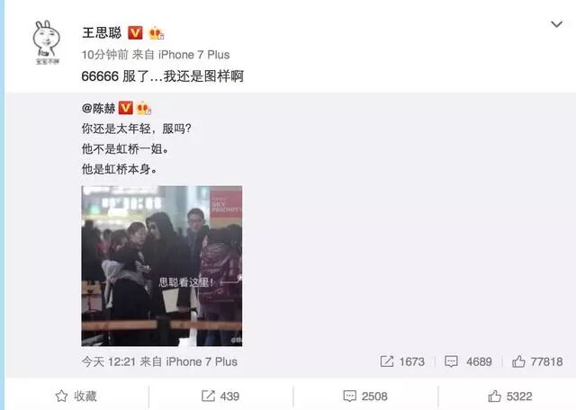 不被虹桥一姐蹲过的名人不算名人,于是不少网友就问王思聪有没有被一姐蹲过,对此,王思聪表示从来没有。然而,今天陈赫却晒出一张照片,照片中王思聪背后虹桥一姐的身影清晰可见。随后,王思聪转发该微博,说还是自己太年轻!!!