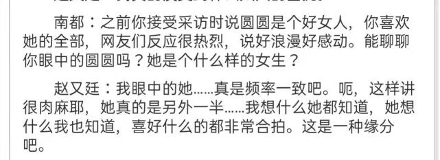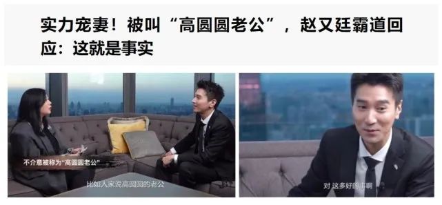 恋情曝光后,赵又廷毫不隐藏对高圆圆的钟意,称自己喜欢她的全部,表示高圆圆就是自己的另一半;婚礼上,两个人相对甜笑,幸福满溢,任谁看都是嫁给(娶了)爱情的模样;被喊“高圆圆老公”,他没有觉得自己被妻子名头压倒,而是自豪表示“这多好的事啊”。
